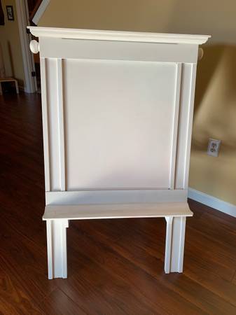 It has a dry erase board on one side and a chalk board on the other. There is a nice ledge on each side for crayons, markers, and paint brushes.