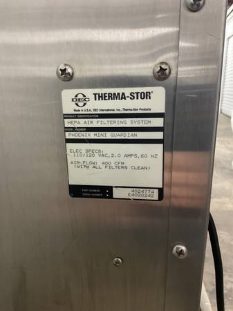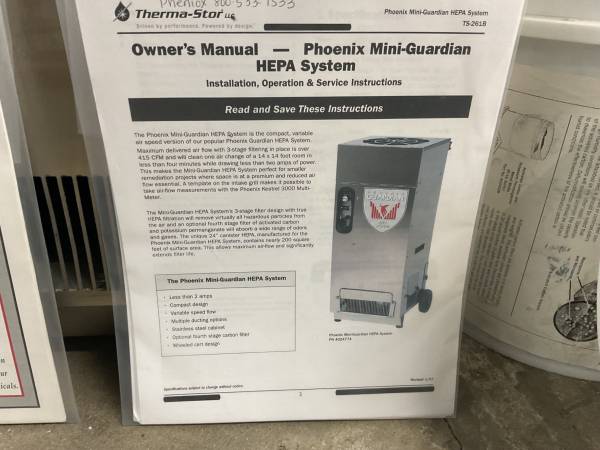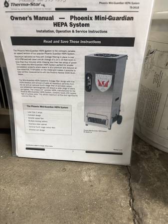Phoenix Mini-Guardian Hepa System air scrubber with extra filter and charcoal. Works as it should. The cash price is $550.00. Serious inquires only and absolutely no scammers. O’Fallon, Mo. a couple blocks off Interstate 70 and Highway K. Six3six-4eight5-eight4three3.