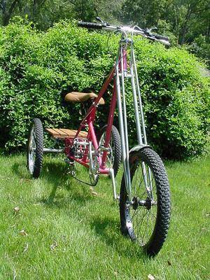 Custom Tricycle Chopper. 21 speed of pedal pumping pleasure. Has old school disk brake and springer front end. 20" wheel/tires (like new).These pics are from its glory days. Now, the forks have some patina but NOT pitted and would be easily cleaned up with scotch Brite and steel wool and could be/should be chromed. Be ready for the Moonlight Ramble this year