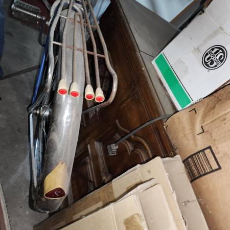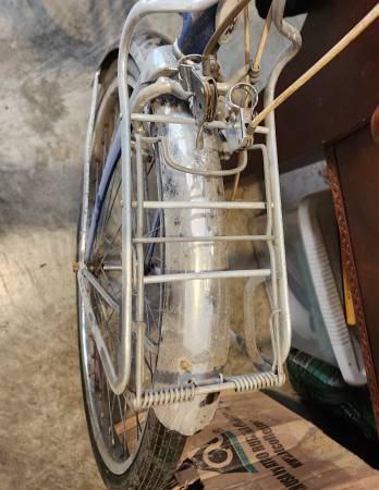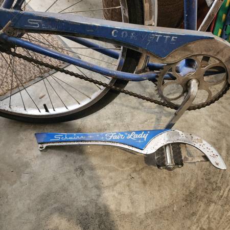 Antique Schwinn Corvette vintage bike. Some extra parts like front and rear fender, taillight housing, and a matching chain guard with Schwinn Fair Lady written on it. It has two, Extra, three speed...