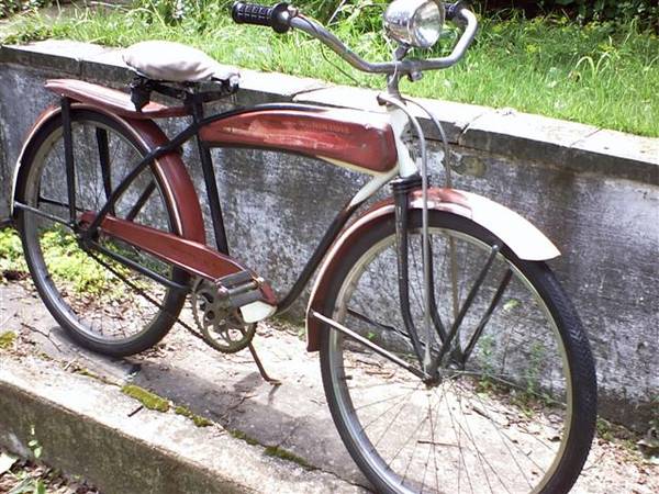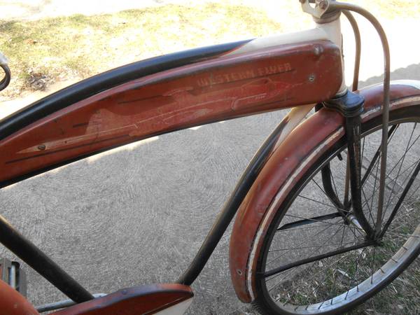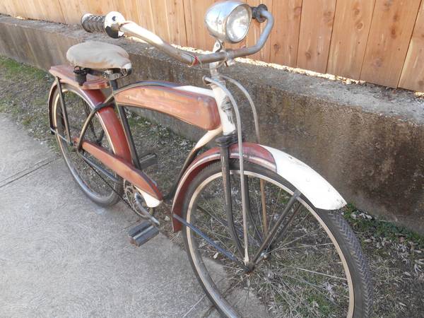 Super cool Western Flyer with tank, tank has an airplane on it , don't know exact age, but probably 53 to 58 I believe this is possibly a Delta Super Rocket Ray Light , rare bike pretty much all original except for the headlight and handlebar grips 314 776 245three