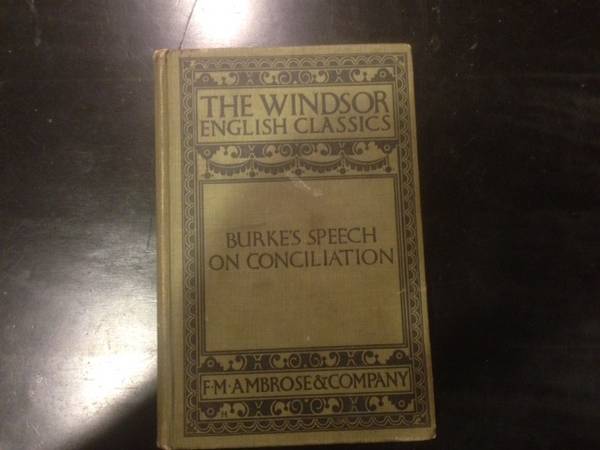 1922 hardback copy of Burke's Speech on Conciliation with the American Colonies. Cover shows very minor shelf wear, especially considering its age. Some writing on inside cover, as seen in pic 2. Please email me or see pics if you have any questions.