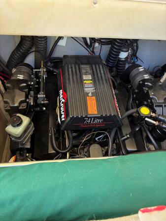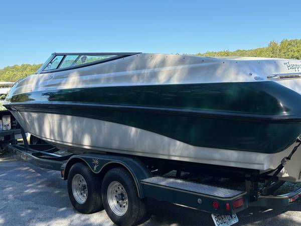 454 7.4 litre Mercruiser with Bravo 3 dual rotating props. Added extended swim platform with marine mat .Located on Indian Point at Table Rock Lake. Custom fit cover. Has eisenglass enclosure from bimini to top of windshield. Always stored on a lift on a covered dock. Some of the photos may show the grey cover it has a 1 1/2 year old black cover. I think the bimini photo is before I removed the gold stripe. Kenwood blue tooth stereo with CD. Well cared for boat that rides great. It is a heavy well built boat that has plenty of power and gets on plane fast with little bow rise. Tons of great storage. I am in St. Louis but the boat can be viewed in it's current location. Has a matching trailer
