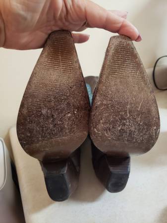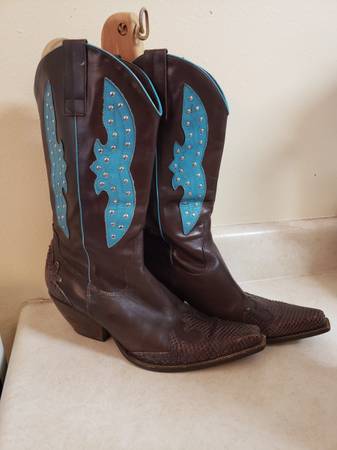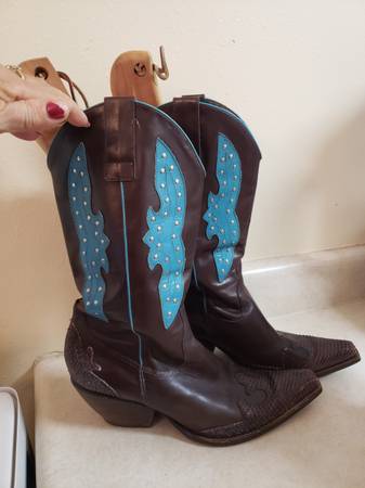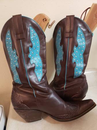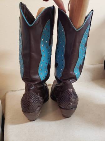 BCBGirls pointy toe snake skin pattern/studded brown & turquoise genuine leather mid-calf western style pull on Boots. Sz. 11.