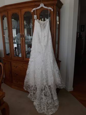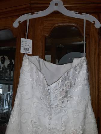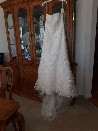 Brand new, strapless, size 8, never worn Oleg Cassini, wedding gown with a beautiful flowing train. The gown has three layers: a satin base, covered with a sheer layer, and finally a detailed lace overlay sprinkled with sequins and beautiful blush roses. The tags are still attached and display the price paid of $1,250.00. Asking $500.00 or best offer.
