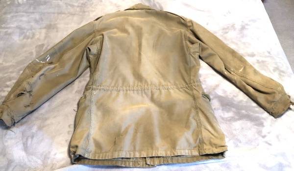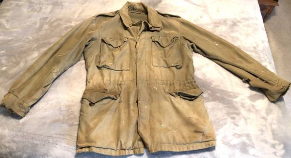 Military field jacket, probably an old M65 field jacket, but no label Standard olive green well used, paint stains, tears, but still very wearable