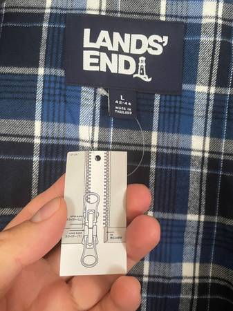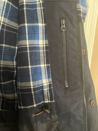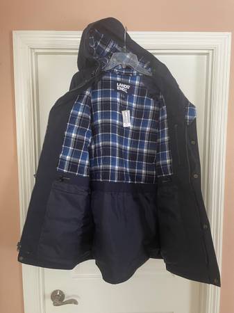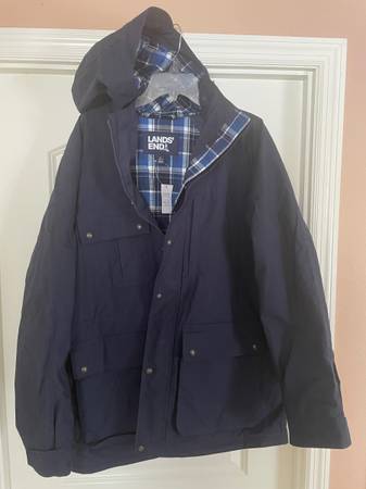 Lands’ End Bayfield Cotton Hooded Parka, Men’s Size Large (42-44), Classic Navy with Plaid Lining, Full Length double zipper with leathered pull and snap storm flap, adjustable Velcro at wrists, adjustable bungee cord waist, attached/adjustable hood, 3 outer pockets with snap closure (plus 2 hand slips), 1 outer zip pocket, 1 interior zip pocket, Material: see tag photo, Brand New with Tags. Asking $50 cash only. Retail price is $180.