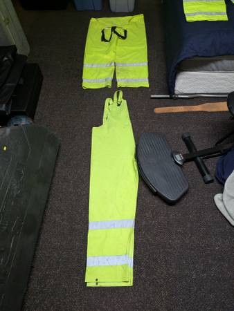 1 pair of hi visibility rain pants with suspenders. Extra large. And 1 rain jacket for $25. Safety Green. Florissant, MO pickup 63031. Cash only.