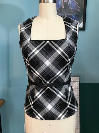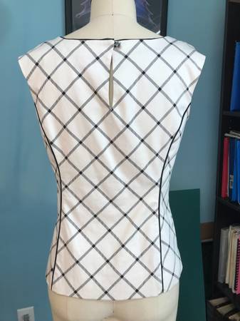White Plaid top with princess seams, bra strap guides, back button, and piping detail. Lined. Machine washable. Gently worn. $20 if bought alone.
