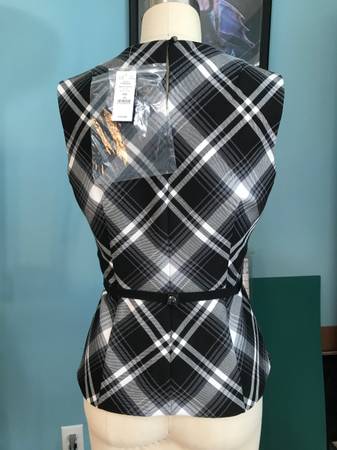 Gray Bristol Plaid top with princess seams, bra strap guides, back button, and black bow belt. Lined. Machine washable. Brand new with tags; excellent gift!
