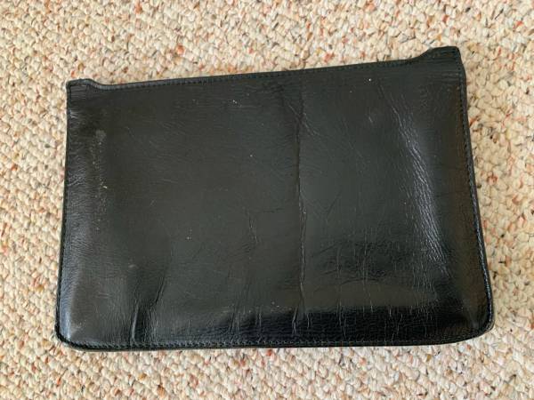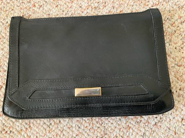 Black Clutch Purse $5 Two zippered compartments Flap snaps 12” x 7” x 2” Excellent condition
