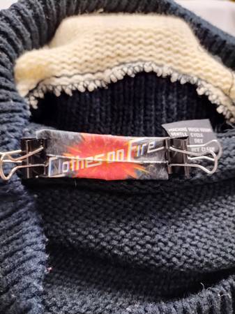 Used - fair condition. Item is fuzzy and has some pilling on it. There is a large discolored stain that makes the fabric a dark purple on the lower left torso, as well as a spot on the underside of both sleeves, and on part of the right torso seam.
