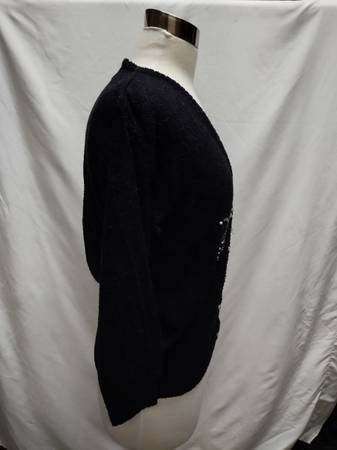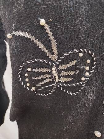 Used - fair condition. One of the butterflies on the left of the garment is only half of a butterfly, but there are no holes in the knit to indicate this wasn't part of the design. There are loose metallic threads and black threads for the butterfly wings and bead-work on both sides. Some of the beads are missing. The garment has many thin pale fibers on it - it would benefit from a lint roller or similar device.