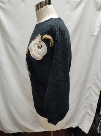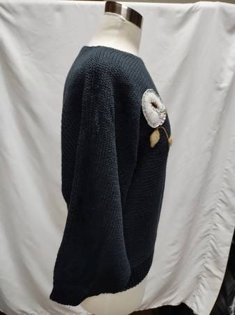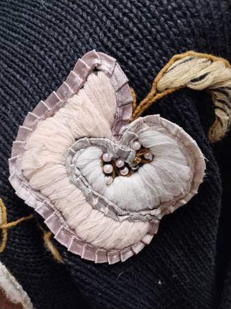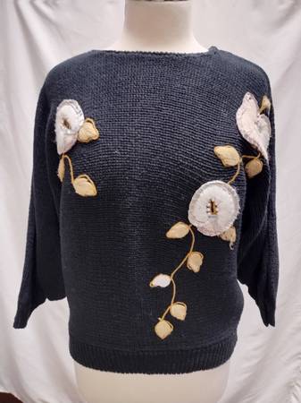 Used - good condition. The knit sweater is in like-new condition, but there are some snags and imperfections on the embroidered flowers.