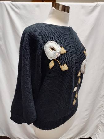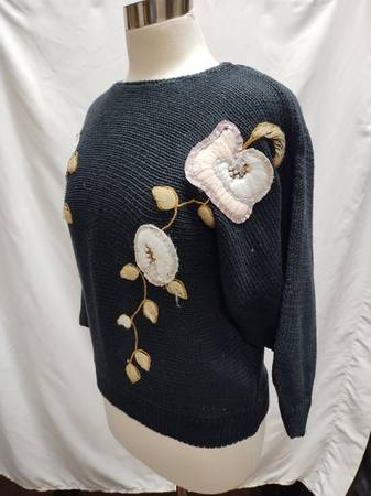 Black knit sweater with dolman sleeves and cuffed sleeves and hem. Flowers and vines are embroidered on the front in yarn and satin, with beads at the center of the flowers.