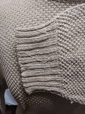 Beige knit sweater with fitted cuffs and hem. Knit pattern is vertical on the body and horizontal on the sleeves.