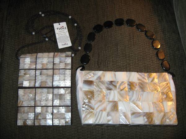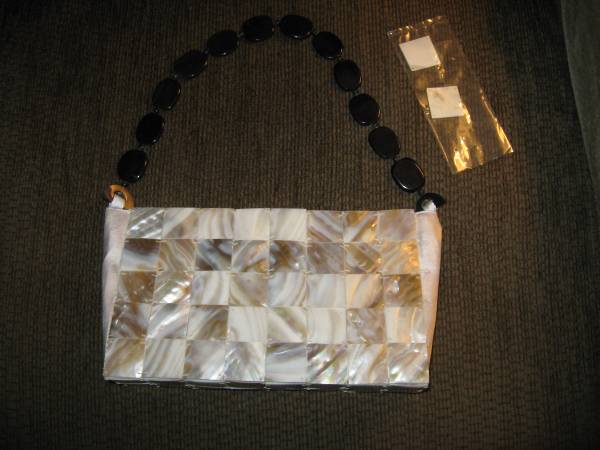 Handbag, fabric lined mother of pearl tiles, snap closure, small zippered compartment, beaded handle, 6 x 11" Made in Vietnam label. Comes with two replacement tiles if future repairs are needed. $15.00.