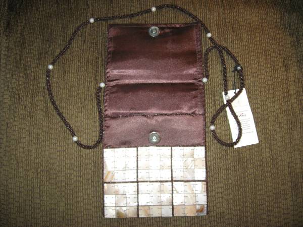 Across the shoulder purse, 6 x 9 inches fabric lined hand sewn mother of pearl tiles with snap closure. "Each piece is unique and handcrafted one at a time using fair trade practices and a living wage commitment." New with tag.