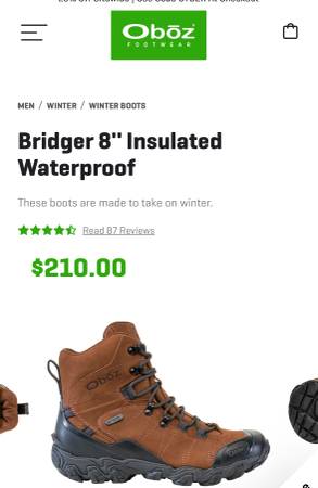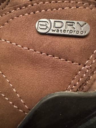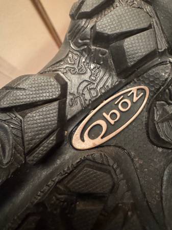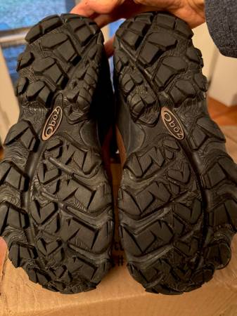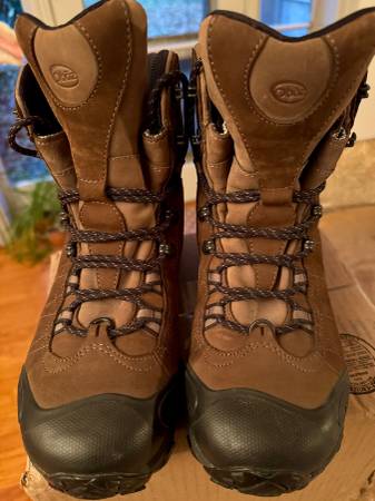 As New (worn for just 15 minutes). Size 9.5M. Seriously rugged hiking boots; waterproof and insulated. These are a current OBOZ model that sells for $210 plus tax.