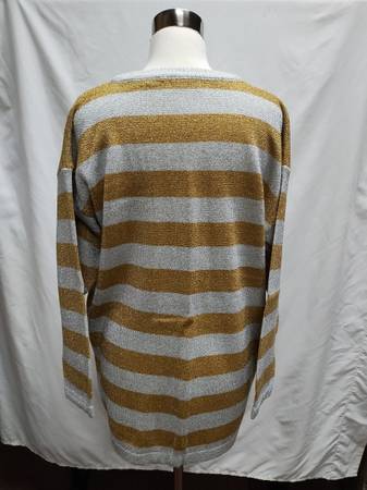 A long, knit, open-front cardigan with two front pockets and stripes of white and bronze mixed with silver and gold metallic thread, respectively. The collar, hem and edges of the garment are made of the same white/silver combination as the stripes, but the different knit pattern makes these sections look whiter.