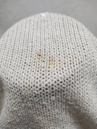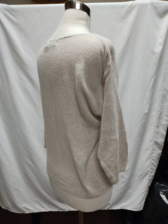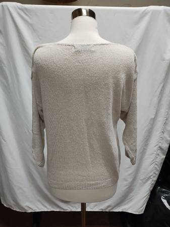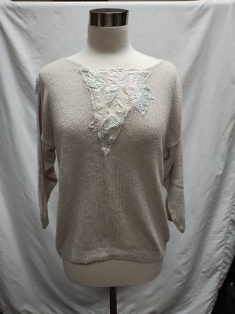 An ivory knit sweater with a boat neckline and pale white fabric flowers with pale green leaves sewn on the chest. The material is lightweight and while the knit is not open, it is easy to see through. Product does not have a size, care, or materials tag.