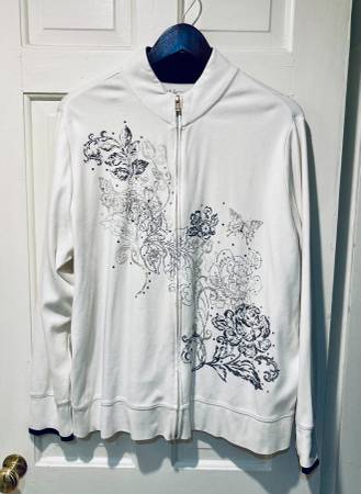 White jacket with floral and butterfly design. Size: 18/20 In great condition.