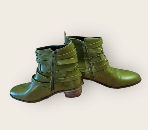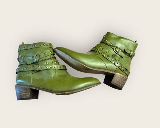 Add a bold twist to your wardrobe with these size 39 green ankle boots, crafted from smooth faux leather and finished with eye-catching studded straps and decorative buckles. The rich green hue offers a unique alternative to standard neutrals, while the 2-inch block heel provides comfortable elevation with a wood-textured finish for added style.