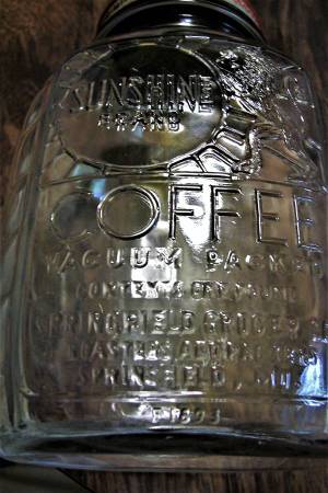 Great shape. Original. Made during WWII. Glass jars were made then to preserve metals for the war. Embossed on the jar is: "Vacuum Packed Contents One Pound, Springfield Grocer Co. Roasters and...