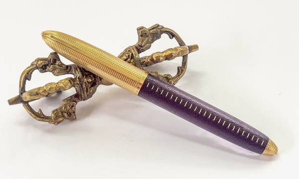 The cap portion screws off the finely-machined threads on the upper end of the lower barrel; the meeting of the top and bottom parts is seamless and almost invisible. There are 24 evenly-spaced, fine gauge gold threads in the leather barrel sheath and they line up perfectly with the clip. The bottom of the barrel has a small cap with the same grid pattern to complete the elegant design of the entire piece.