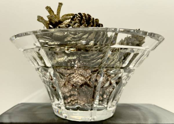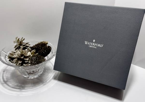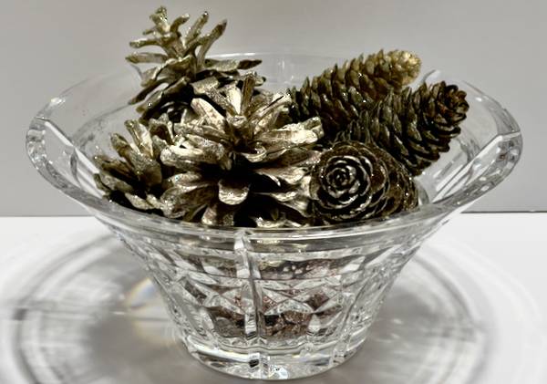 The sparkly pine cones shown are INCLUDED in the sale price. Comes with its original box and Waterford sticker on the bottom of the bowl.