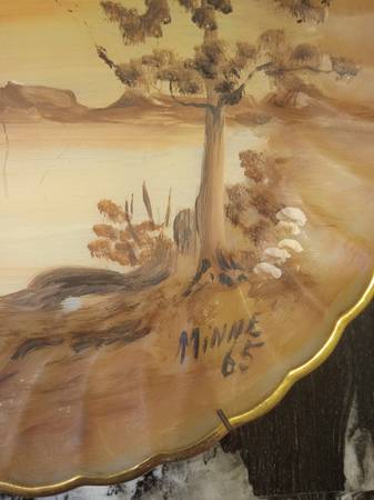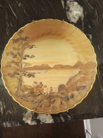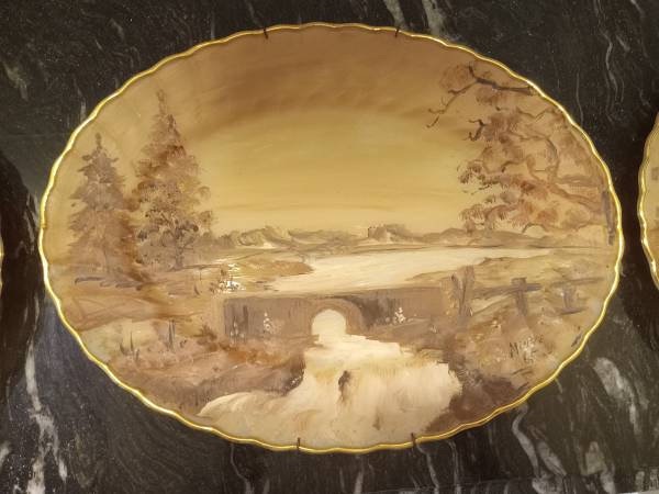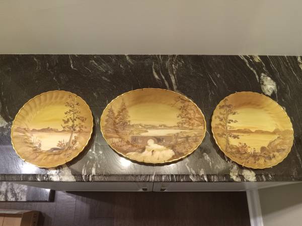Here are 3 beautiful hand painted gold rim plates 2- plates 1- platter Nature scene Signed Minne 65 They have a spring hanger on the back if you wish to hang them on the wall. They have been...