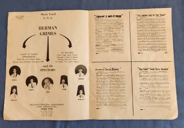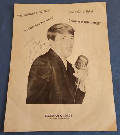 * Herman Grimes autographed promotional 4 page booklet. Text on booklet reads, “To Judy, love ya.’ Herman Grimes.” Black and white booklet measures 8 1/2 inches by 11 inches and includes Grimes and The Spectors photos and sheet music images. Herman Grimes is a member of the St. Louis Music Hall of Fame. $5