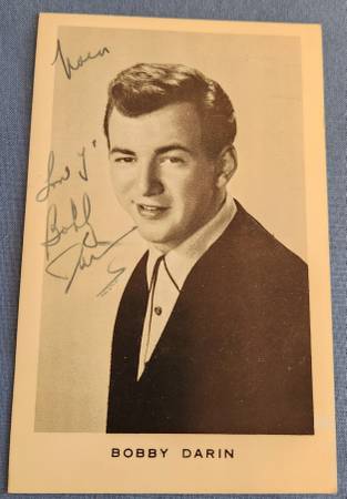 * Bobby Darin autographed promotional photograph. Text on photo reads, “Love y’ Bobby Darin.” Black and white photo measures 3 1/2 inches by 5 1/2 inches. $5