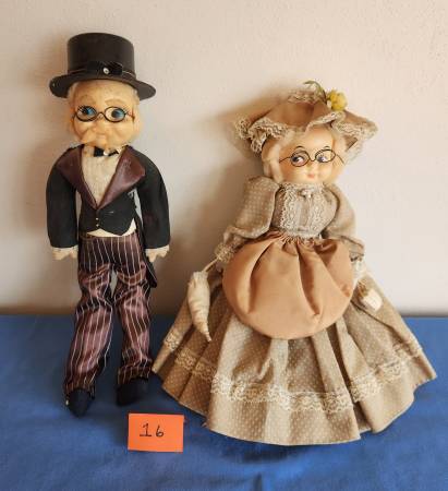 16) Fashionable dressed couple dolls made of cloth bodies and hard plastic heads and painted eyes. Dolls stand 14 inches high. Male doll dressed in early black tux and brown stripped pants. Has homemade black hat with metal glasses. Female doll dressed in brown dress, petticoat, bonnet and apron. Also comes with metal glasses, necklace, cotton clutch and homemade purse. $10