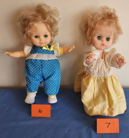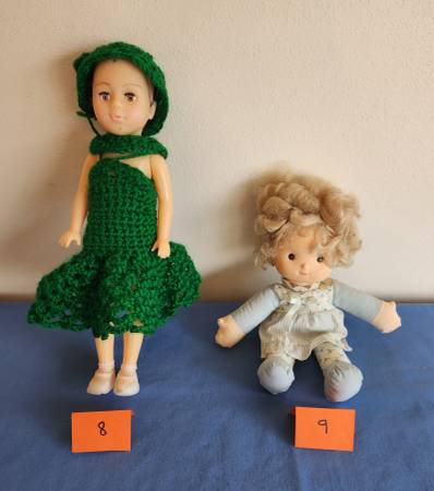 6) Soft plastic movable doll with sleepy eyes and blonde hair. Soft body wearing original blue polka dot jumper. Removable plastic shoes and cotton socks. Stands 10 inches high and is marked on back of head “1989 Cititoy 68077” and “China T912.” Blonde hair. $5
