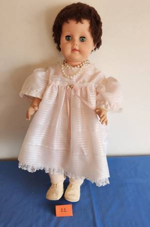 11) Large movable doll with hard plastic body and soft plastic head. Stands 24 inches high. Has brown hair, working blinkly eyes and opening for toy bottle in mouth. Wearing pink dress, white and yellow underpants and removable cotton socks and plastic shoes. Also wearing string of pearls. Marked “VI” on neck. $10
