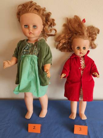 2) Hard and soft plastic moveable doll with worn sleepy eyes. Stands 19 inches high. Wearing a homemade green dress and jacket. No visible markings. Red hair. $5