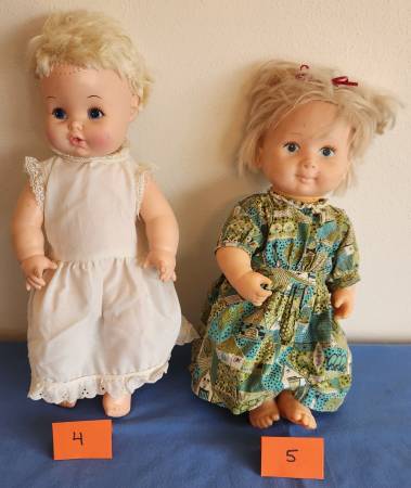 4) Soft plastic body with hard plastic head movable doll. Blonde hair with opening in mouth for toy bottle. Marked on back of head “Eegee Co. 1971” and on back of body “10 SF PE.” Stands 15 inches high and wearing a white cotton dress. Blonde hair. $5