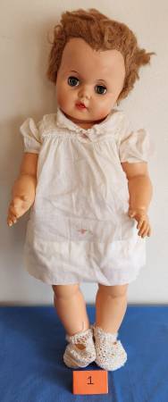 1) Large hard plastic body and soft plastic head baby doll. Movable body with white cotton dress and shorts with knit booties. Stands 22 inches high, has working sleepy eyes and opening for pull cord on back of body. Opening in mouth for toy bottle. Stamped “Uneeda 16” on back of head. Red hair. $10