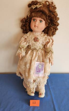 12) Porcelain doll with original paper tag, “Collectible Memories – Rachel.” Doll stands 20 inches high on metal stand. Wearing the original lace over brown dress, pants, socks and leather shoes. Curly brown hair with attached lace bows. $20
