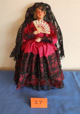 17) Bisque Mexican doll with painted face and hands and body. Doll stands 13 inches high and is a female dressed in long red dress with black lace covering. Also has long black lace veil and plastic hand fan. Painted black shoes. No visible markings. $10