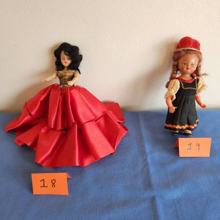 18) Hard plastic movable doll with working sleepy eyes. Doll stands 10 inches high. Dressed in a long red silk dress with black lace bodice. Painted white shoes and has black hair. No visible markings. $5