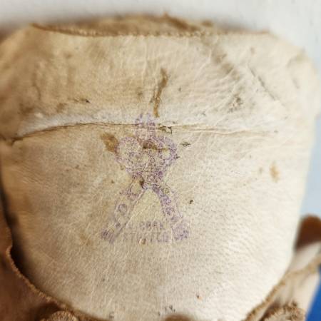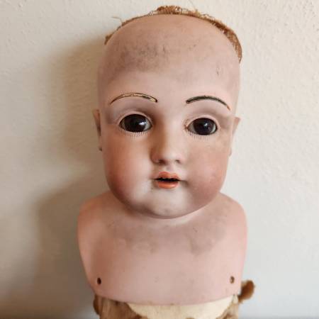 20) Bisque JDK Kestner doll in detached condition. This doll has the complete shoulder head, but missing the hair. The kid leather body, arms and legs are in heavily worn condition. The crown stamp is visible on the body. The doll is marked “Dep 10 195” and “F made in Germany” on the back of the head. The sleepy eyes are in working condition. No pierced ears and missing fur eyebrows. The brown lace top and pants are in poor condition. The doll is 18 inches high. $25