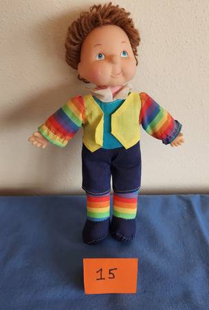 15) Cloth body boy doll with soft plastic hands and moveable head. Stands 10 inches high. Wearing rainbow top and blue shorts to match rainbow design of legs. Fixed eyes and brown hair. $3