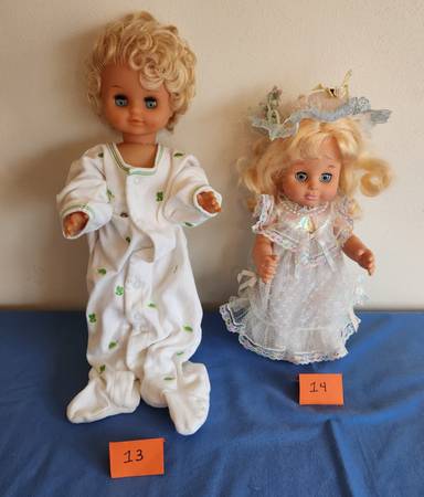 13) Soft body and head doll with working sleepy eyes. Stands 16 inches high. Swivel head and movable body. Blonde hair. Wearing store purchased baby onses clothing. No visible markings. $5