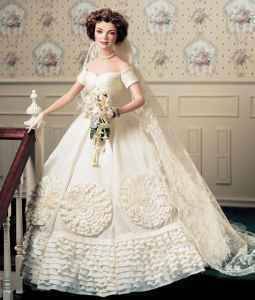 The ultimate Wedding Portrait Doll of the beloved First Lady, just as she appeared on her wedding day on September 12, 1953. Hand-painted porcelain captures her dreamy likeness, evoking her charm and grace with artistic vision. Her famous gown has been authentically re-created in lavish cream taffeta, with rose point and ivory point d?esprit lace. She wears a rhinestone bracelet and a faux-pearl necklace. Hand-numbered edition.