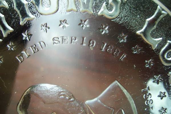 This plate represents the mourning for our 20th president of the U.S. who was shot on Jul. 2, 1881, less than four months after his inauguration. He succumbed to these wounds Sept. 19, 1881.