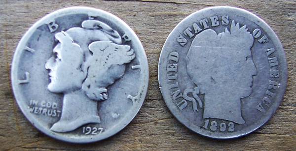 1892 Barber dime $10. 1927-S Mercury dime $6. Buy individually as indicated or both for $15. Meet to exchange or add $3 to send.