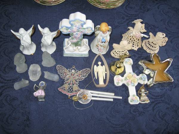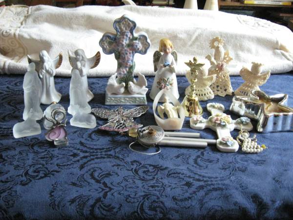 Lot of Angel/religious items: Angel figurines and bells, Glossy ceramic cross with doves, Cross with flowers, frosted glass Nativity Set, wind chimes, crochet thread ornaments, angel-shaped candle--all for $5.00.