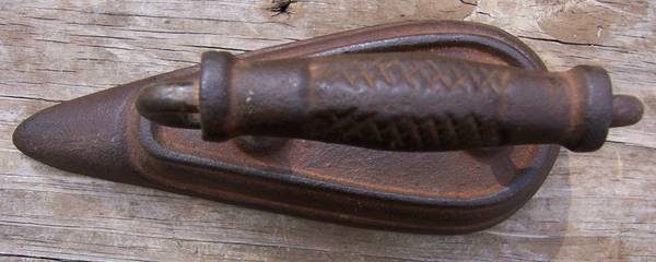 The best way to describe this sad iron is "An Old Antique." 1800s. A true antique iron that measures 6 1/2" long by 2 1/2" widest and is 3 5/8" high. Meet to exchange or add $15 to mail.